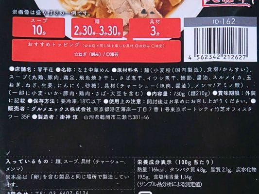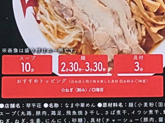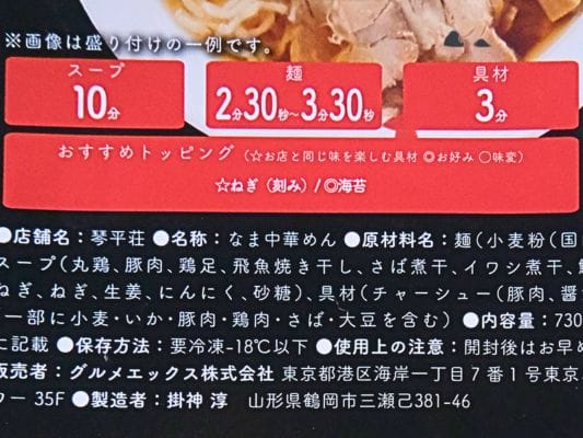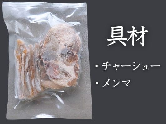 | 内容量 | 【総重量730g】 麺:210g スープ 具材 (チャーシュー・メンマ) |