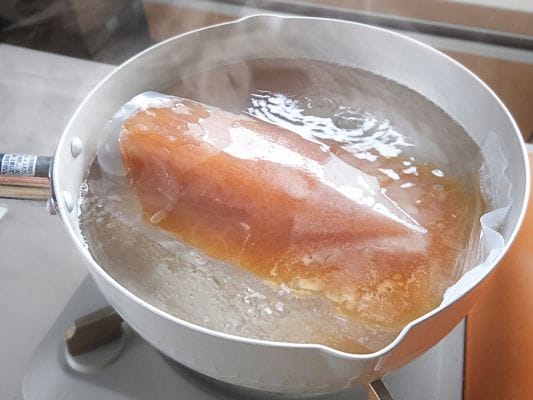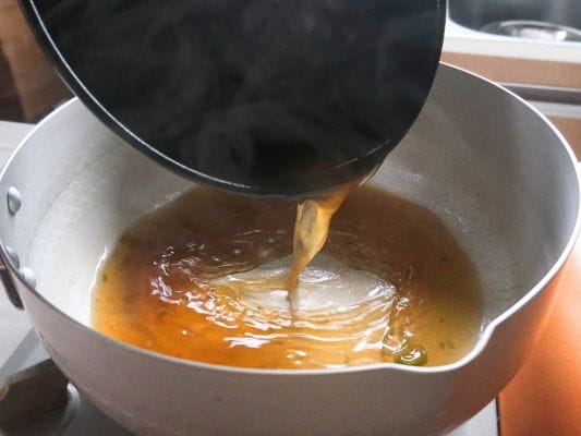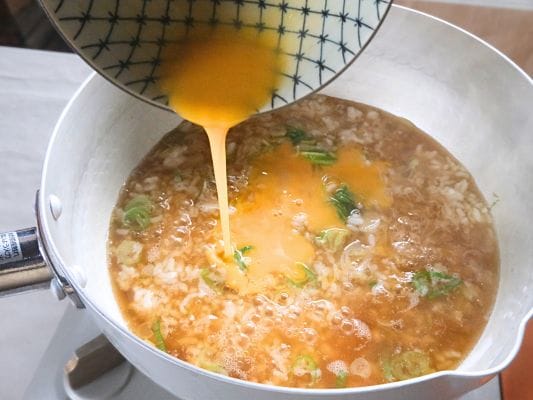 グツグツしてきたら溶き卵を回し入れて火を止めます。