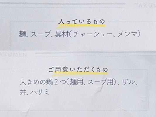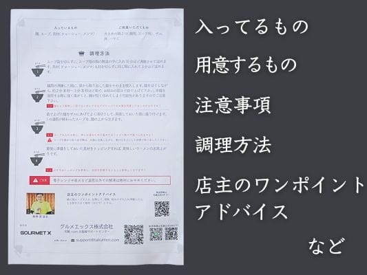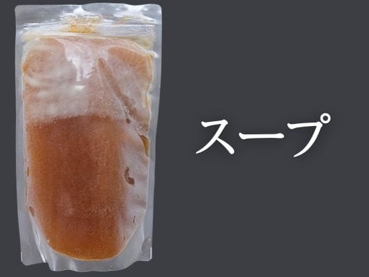 袋の中には麺・具材・スープ・説明書の4点セットが入っています。