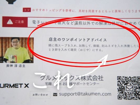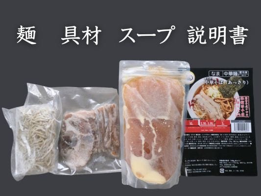 | 原材料 | 【麺】 麺(小麦粉(国内製造)、食塩/かんすい) 【スープ】 スープ(丸鶏、豚肉、鶏足、飛魚焼き干し、さば煮干、イワシ煮干、鰹節、醤油、スルメイカ、玉ねぎ、ねぎ、しょうが、にんにく、砂糖)、具材(チャーシュー(豚肉、醤油)、メンマ/アミノ酸)、(一部に小麦・いか・さば・大豆・鶏肉・豚肉を含む) ※宅麺公式商品ページに記載の情報 |