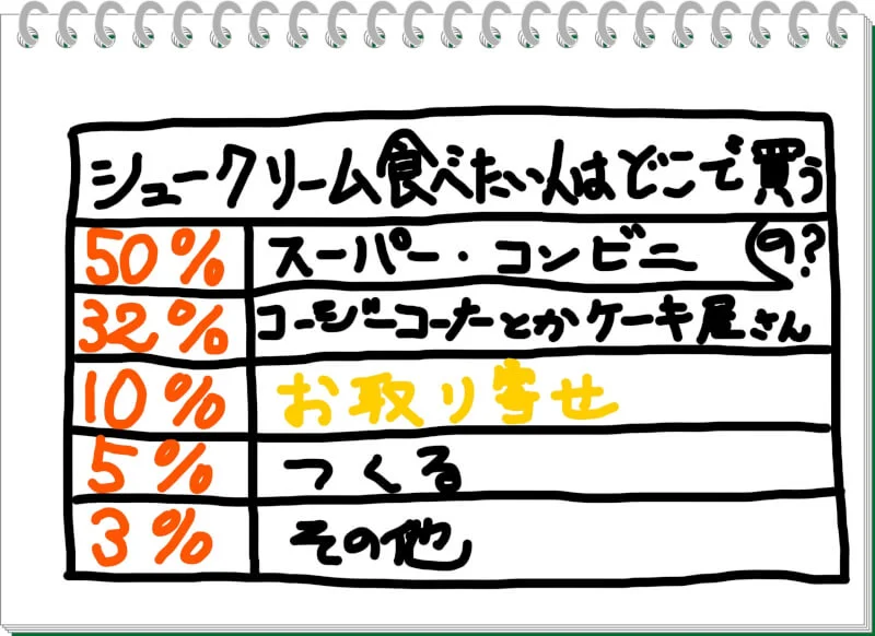この表をよーく見ると一目瞭然ですなんですが、お取り寄せでシュークリームを買う人は全体の約10%しかいないんですよね…