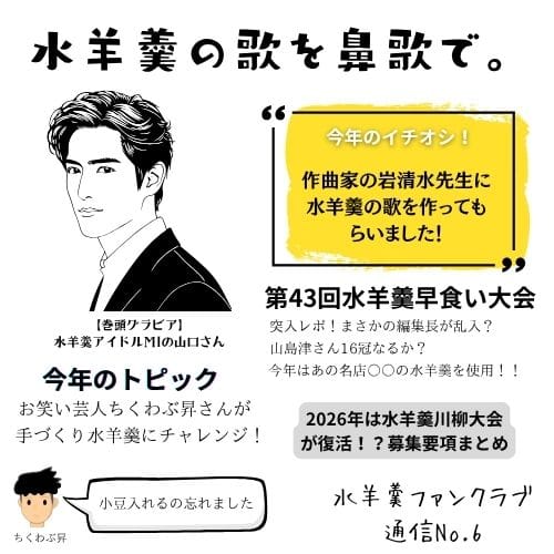 まずはモッサリ&優しい風貌の男性が好評の、2021年6月発行水羊羹ファンクラブ通信No.3☟