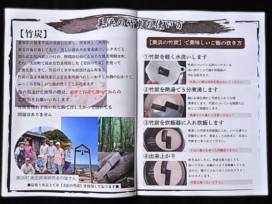 店舗では竹炭で炊いたご飯が提供されてるんですが、通販でも再現できるように「美浜の竹炭」が付属されてます。