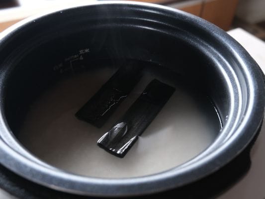 軽く湯切りした竹炭を炊飯釜に入れて、いつも通りに炊飯を開始します。